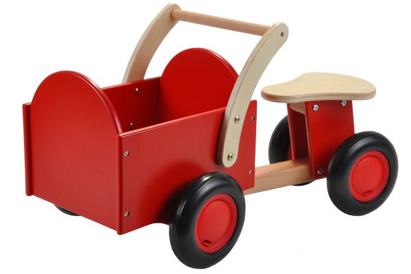 Bedankt voor deze leuke loopfietsen. De houten bakfiets hadden we al een keer in zo\'n winkeltje bekeken. Daar koste deze ongeveer 95 euro. Dat scheelt toch wel heel veel. Pakket kwam inderdaad zoals op de site stond aangegeven binnen 1 dag thuis. Dat is toch super! We zijn er heel blij mee.